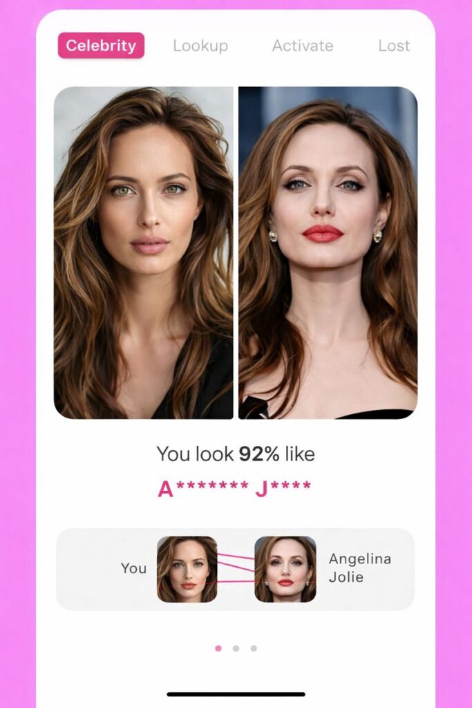 O aplicativo Look alike – Celebrity se diferencia pelo seu foco em categorização e segmentação. Seu grande trunfo é um banco de dados categorizado com mais de 3.000 famosos de várias áreas, de atletas a youtubers. O diferencial é a filtragem por região, permitindo que usuários brasileiros busquem semelhanças especificamente com celebridades nacionais, um nicho pouco explorado por apps globais.